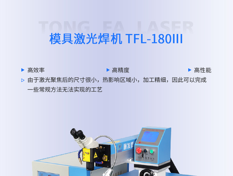 普通型模具激光焊機(jī)TFL-180Ⅲ是通發(fā)激光公司的模具激光焊機(jī)中銷量較大的傳統(tǒng)型,配置激光頭手搖升降與工作臺按鈕電動升降實現(xiàn)焊接不同厚度模具的激光焊加工。本系列機(jī)型適用于各類精密注塑模具激光補焊、壓鑄模具激光修補焊接;同時也適合鑄件沙孔激光修補、模具磨損激光修復(fù)、過切加工等的激光修補;各類金屬結(jié)構(gòu)件激光焊接加工、不銹鋼首飾激光焊接加工。