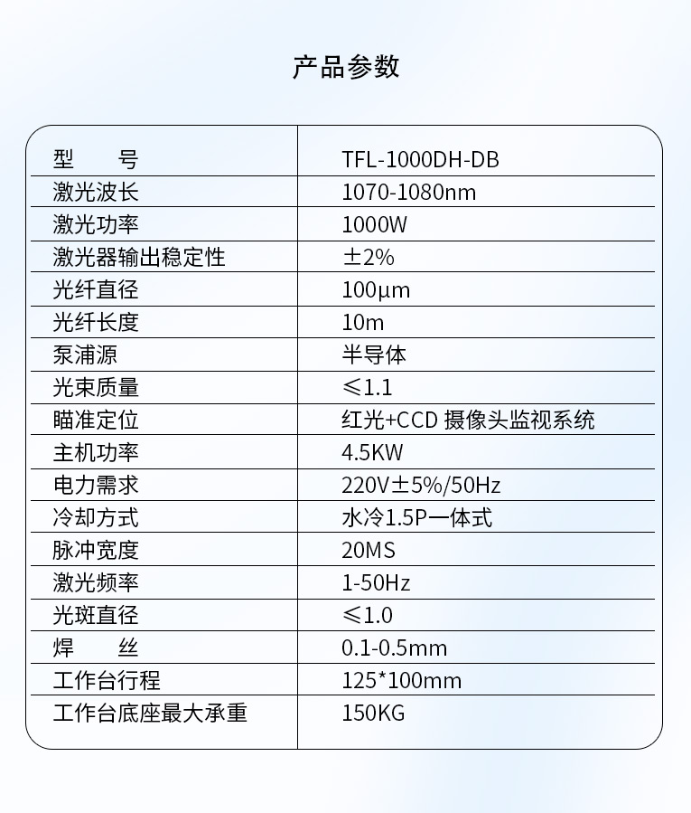 采用光纖激光器,反射率高,能量強,免維護,免調(diào)光,功耗少,相比傳統(tǒng) 模具焊來說,體積小,安全,穩(wěn)定性好超長使用壽命。 1000W光纖激光器,滿足銅、鋁焊接量大的模具及產(chǎn)品焊接加工需要。 高承重底座及工作臺,保持輕便靈活的優(yōu)點,同時提供更高承載能力。 配備.1.5P大功率一體式水冷水機,保證了大功率焊接的穩(wěn)定性。