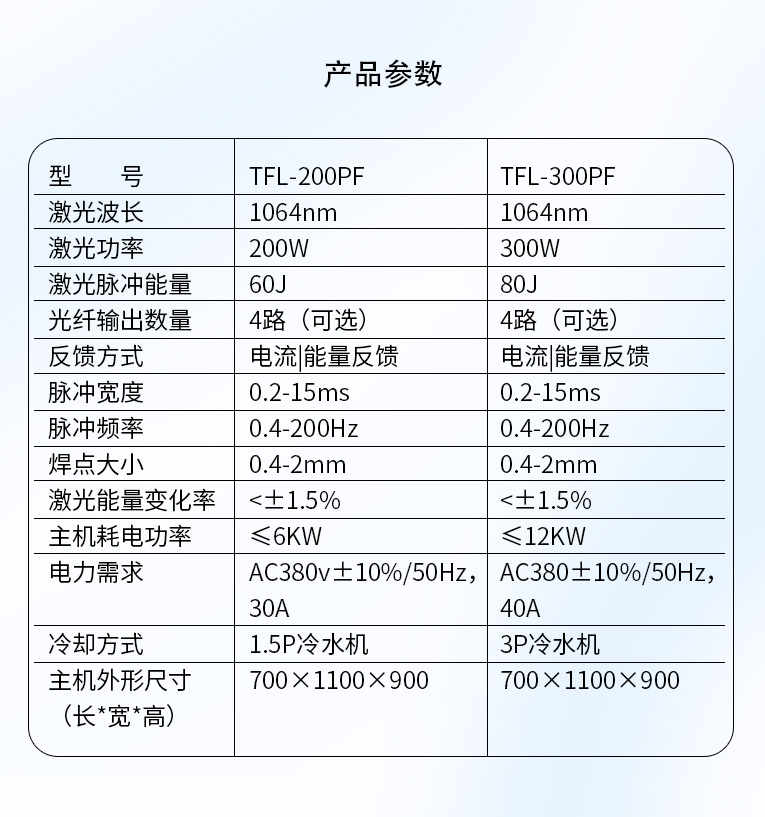 TFL-200PF/300PF光纖激光焊機是一款高穩定性、中功率的光纖激光焊機,滿足長時間生產的需要。大功率激光電源,大功率散熱系統滿足24小時大批量生立。機身采用高強度結構,保證精度、性能穩定。焊接控制系統是專為激光焊接度身定做的專業4軸控制系統,穩定性高,易學易懂易上手。擴展性強,可結合流水線、光電傳感器、氣動夾具等組合進行全自動無人值守式加工。可進行時間分光或能量分光,適合不同加工的場合的應用,多工位加工應用,可以廣泛應用在點焊、連續焊及柔性加工需求行業等激光焊接。